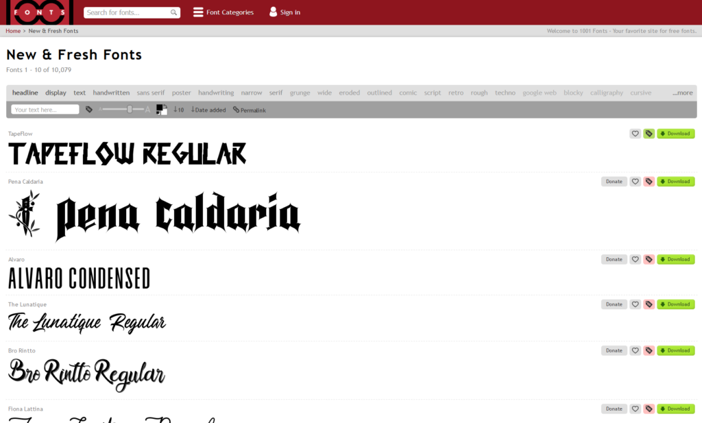 1001 Fonts to jedno z najpopularniejszych narzędzi dla osób poszukujących darmowych fontów, obecne w sieci już od wielu. Dlatego też może pochwalić się pokaźnym zbiorem, obejmującym już niemal 10 tysięcy pozycji.