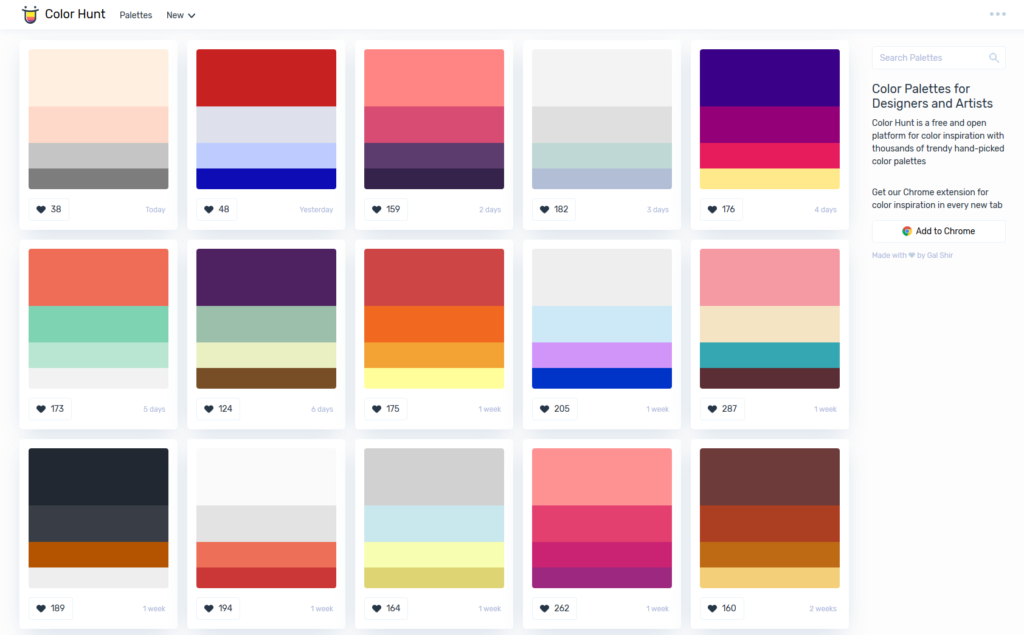 „Color Hunt to darmowa i otwarta platforma z inspiracjami w dziedzinie kolorów, zawierająca tysiące ręcznie dobranych palet” – tłumaczą twórcy.