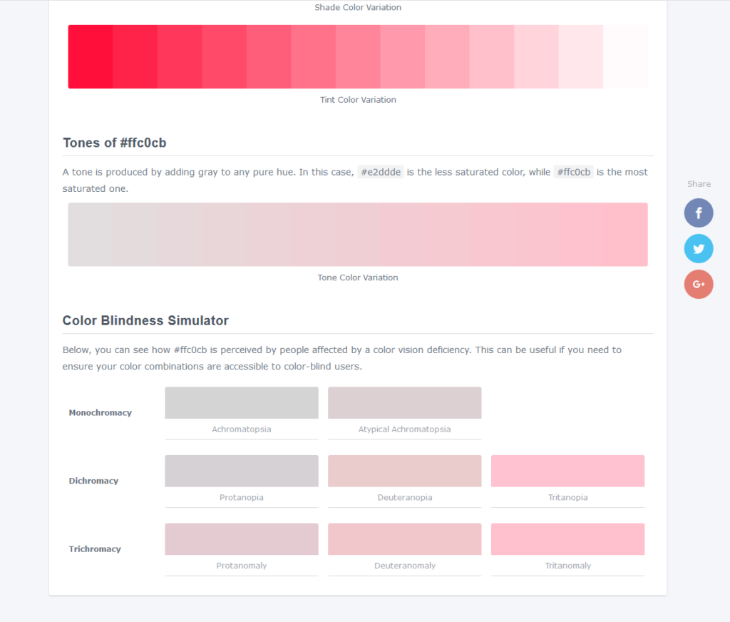 Na samym dole jest jeszcze istotna symulacja tego, jak wybrany przez nas kolor widzą osoby cierpiące na ślepotę barw, z podziałem na przeróżne rodzaje tego zaburzenia wzroku. To istotne przy dbaniu o przestępność naszego projektu.